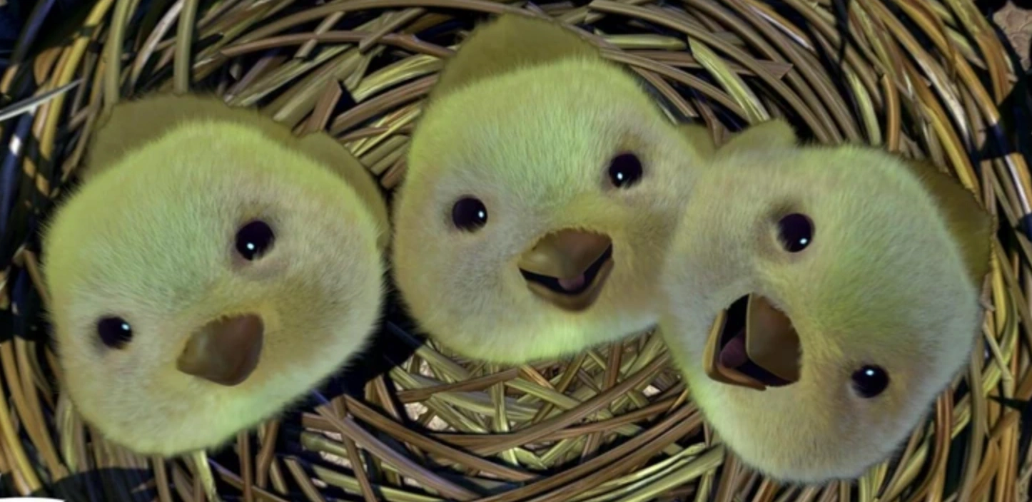 The chicks are the first Pixar characters who are newborns. (Unless you count a newly bought toy to be considered born, in which that case Buzz Lightyear would take this title)
