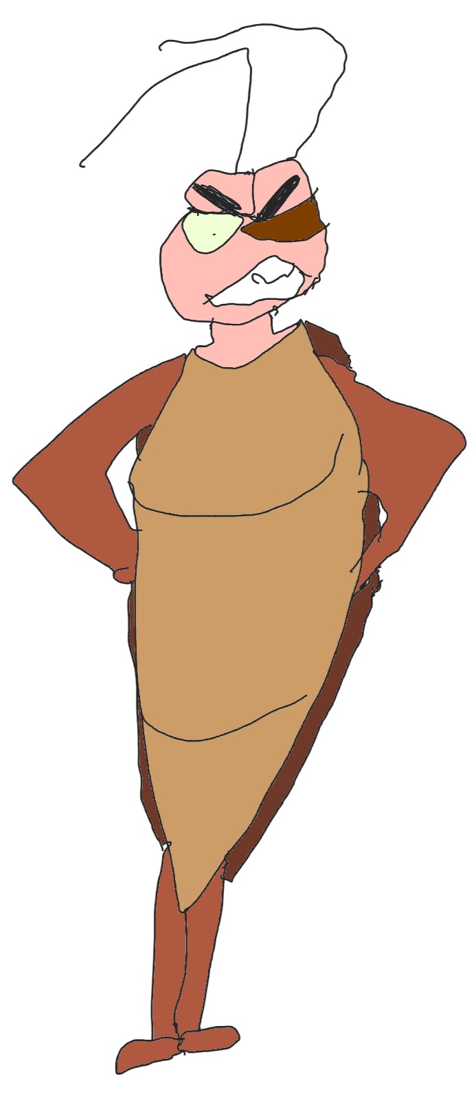 A cockroach with a brown leaf eyepatch in his eye, and has black eyebrows.